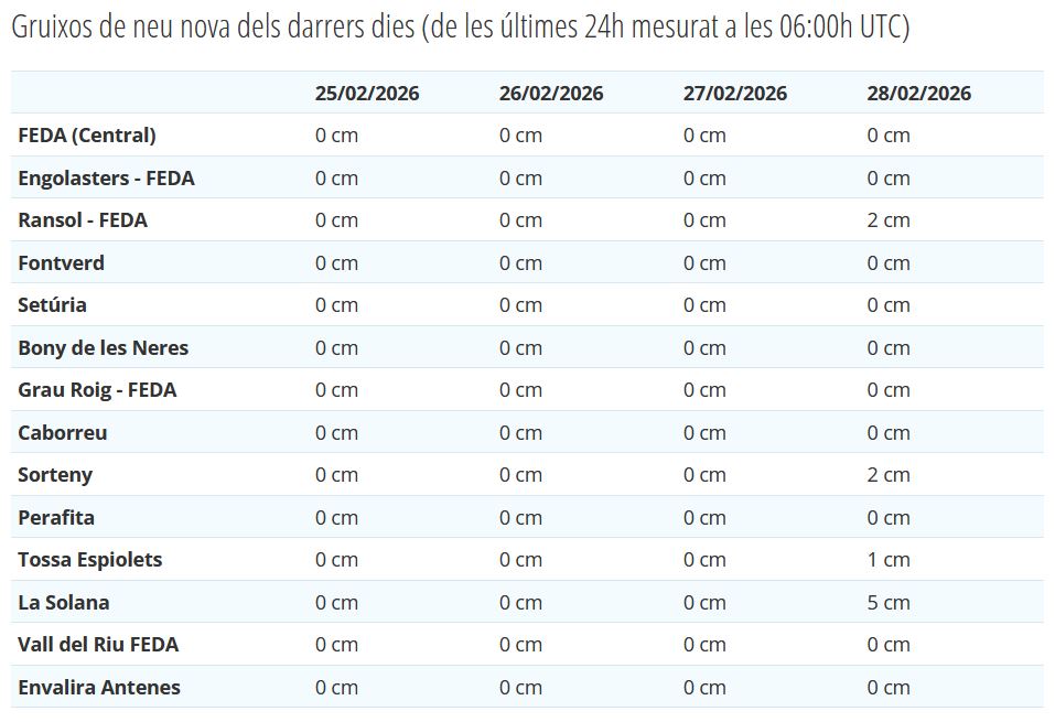 Dades corresponents al dia climatològic. Corresponen amb les dades que es poden consultar a l'apartat de climatologia, als resums mensuals. Per garantir la comparació amb les mesures històriques les precipitacions es mesuren de 6 UTC del dia al que correspon la dada a les 6 UTC del dia següent, igual que les temperatures màximes, mentre que les mínimes mostren el valor mínim entre les 18 UTC del dia anterior i les 18UTC del dia al que correspon la dada.